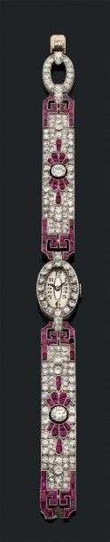 Montre de dame en platine et or gris 18k composée d?un bracelet ruban serti de diamants rehaussé d?un décor de rubis naturelles et synthétiques calibrés, au centre un cadran ovale serti de diamants.Mouvement mécanique Jayeff Watch co en l?état. Vers 1925 Long.: 18.5cm Poids brut: 39.3gr A ruby, diamond, white gold and platinium Lady's watch.