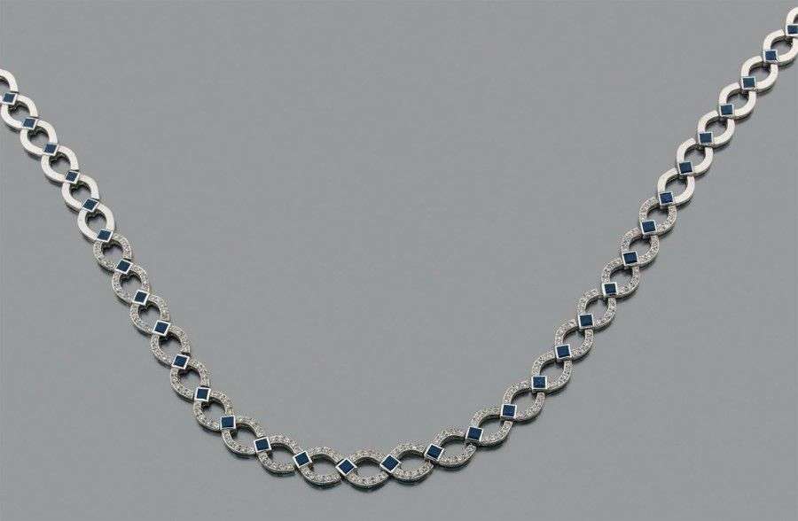 Collier en or gris 14k stylisant une succession de volutes serties sur la partie centrale de diamants de taille brillant et intercalés de saphirs de taille carré. Long.: 46.5 cm env. Poids brut: 49.4 gr