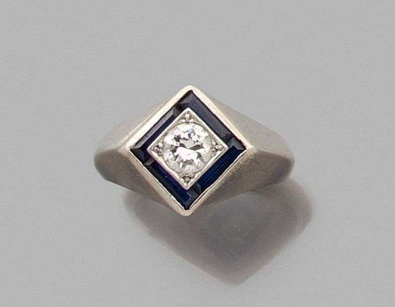 Chevalière en or gris 18k sertie d'un diamant de taille brillant dans un entourage de saphirs calibrés. Poids du diamant: 0.60 ct env Tour de doigt: 58 Poids brut: 11.25 gr A diamond, sapphire and white gold ring.