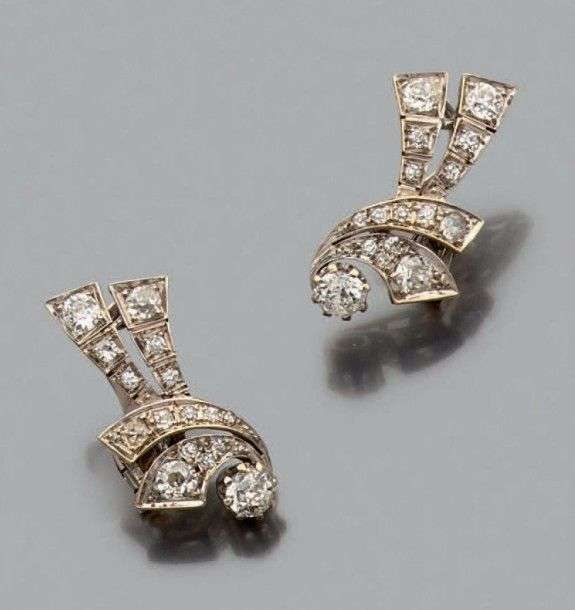 Paire de clips d'oreilles en or gris 18k "volutes" serties de diamants de taille ancienne. Poids brut: 7.6 gr A diamond and white gold pair of earrings.