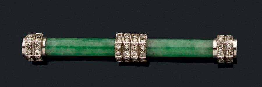 Broche "barette" en platine composée d'un batonnet de jade rehaussé de motifs sertis de lignes de petits diamants. Long.: 7 cm env. Poids brut: 14.7 gr A jade, diamond and platinium brooch.