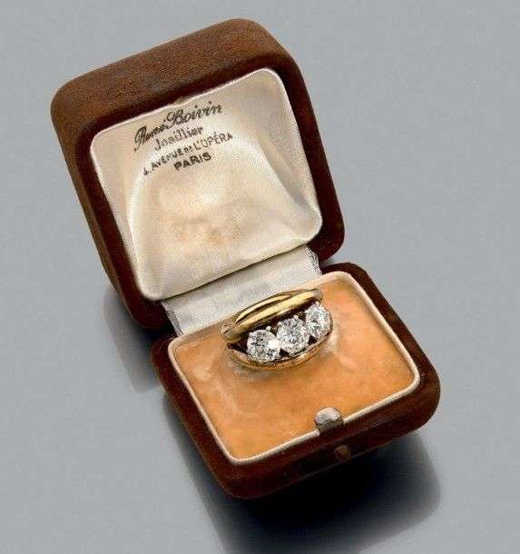 Bague jonc en or jaune sertie de trois diamants de taille ancienne. Vers 1945 Egrisures importantes sur les diamants Accident à l'anneau Tour de doigt: 50 Poids brut:10.5gr Accompagnée d'un certificat d'authenticité de Madame Françoise Cailles A diamond and yellow gold ring by René Boivin.