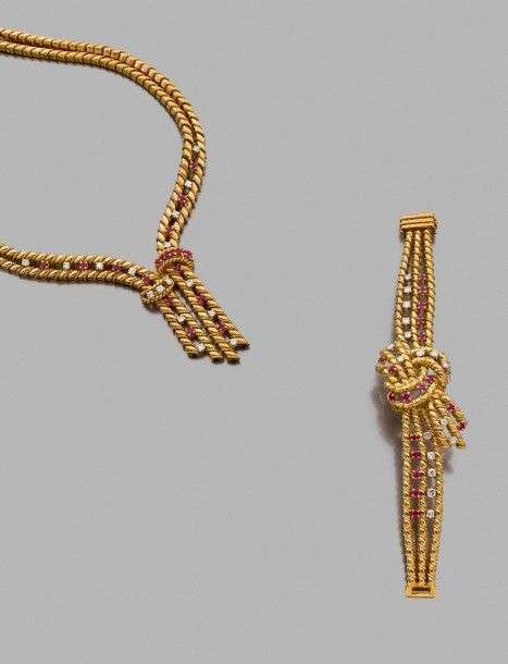 Parure composée d'un collier et un bracelet articulés en or jaune 18k dessinant un ruban noué rehaussé de diamants de taille brillant et de rubis. Poids brut: 19.51 gr A diamond, ruby and yellow gold necklace and bracelet.