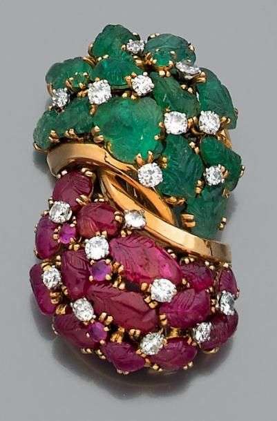 Ensemble composé d'une broche et une paire de clips d'oreilles en or jaune 18k et platine sertis de rubis et émeraudes gravés rehaussés de brillants. Vers 1960 Poids brut: 30.6grgr A ruby, emerald, yellow gold and platinium brooch and pair of earrings.