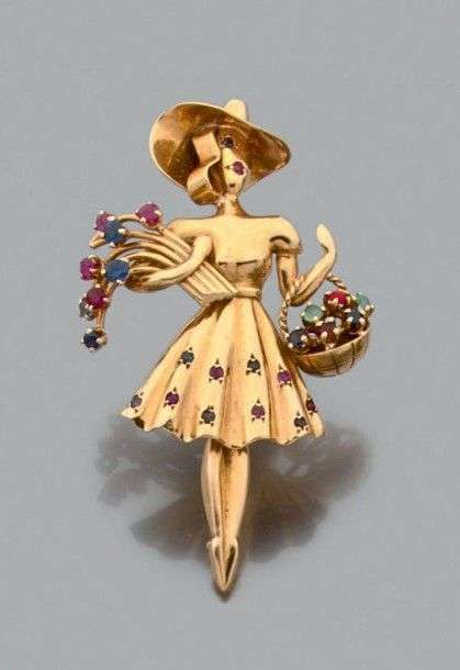Broche en or jaune 18K "femme aux fleurs" rehaussée de saphirs et rubis. Signée. Haut.:5.5cm Poids brut: 11 gr A sapphire, ruby and yellow gold brooch by Lacloche.