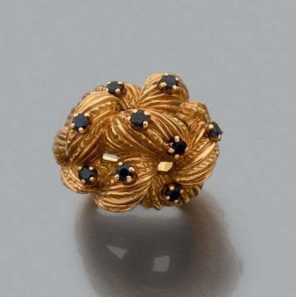 Bague boule en or jaune 18k tressé et rehaussé de saphirs. Tour de doigt: 51 Poids brut: 19.4 gr A sapphire and yellow gold ring.