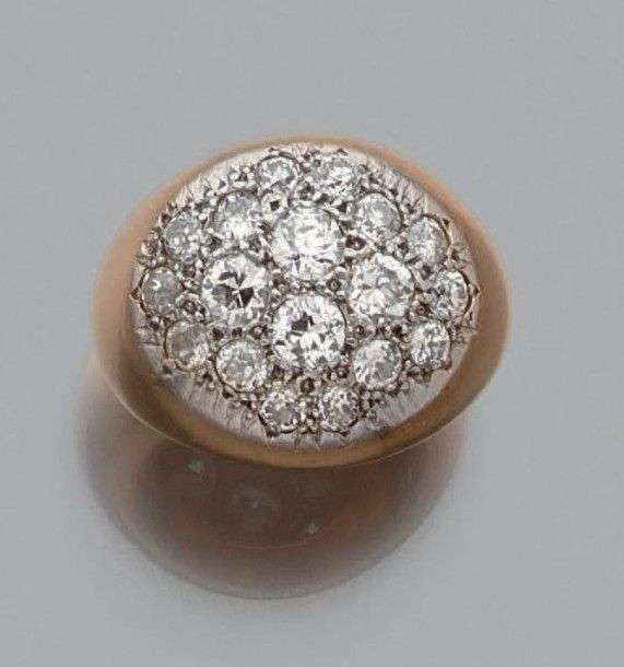 Bague "boule" en or jaune et gris 18k sertie au centre d'un pavage de diamants de taille ancienne. Tour de doigt: 53 Poids brut: 15.77gr A diamond, yellow and white gold ring.