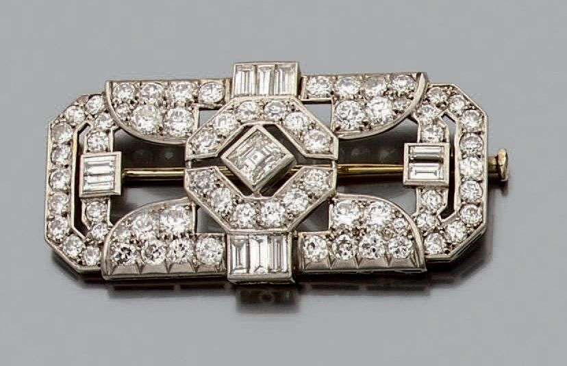 Broche "plaque" en platine et or gris 18K sertie de diamants de taille ancienne et baguettes et au centre d'un diamant carré plus important. Larg.: 4.5 cm env. Poids brut: 11gr A diamond, white gold and platinium brooch.
