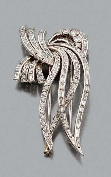 Broche "volute" en platine et or gris 18k sertie de diamants baguettes et de brillants. Haut.: 5.5 cm env Poids brut:21.1gr A diamond, white gold and platinium brooch.