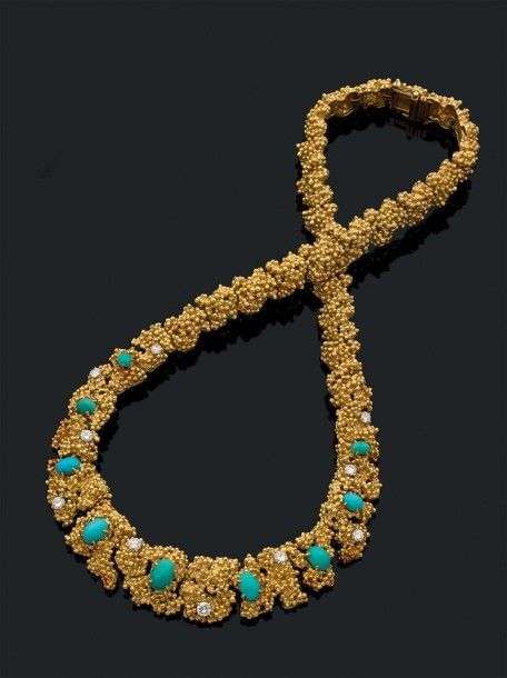 Collier articulé en légère chute en or jaune 18k rehaussé de diamants de taille brillant et turquoises cabochons. Vers 1960. Signé et numéroté. Dans son écrin d'origine. Poids brut: 109.7gr A turquoise, diamond and yellow gold necklace by Boucheron.