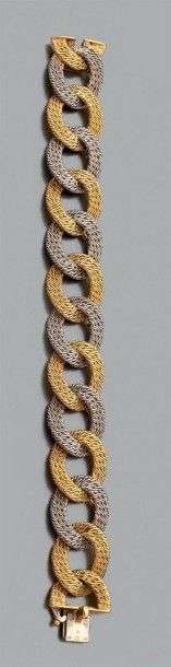 Bracelet articulé composé d'une alternance de maillons en or jaune et gris 18k tressé. Signé. Poinçon de maître Georges Lenfant. Long.: 18 cm env. Poids brut: 55.4 gr A white and yellow gold bracelet by OJ Perrin.