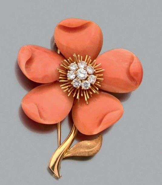 Clip «Rose de Noël» en or jaune 18K composé d'une fleur à cinq pétales mouvementés en corail, le pistil rayonnant serti de diamants taillés en brillant. Vers 1970. Signé et numéroté. Ecrin. Poids brut: 22.4 gr A coral, diamond and yellow gold brooch by Van Cleef & Arpels.