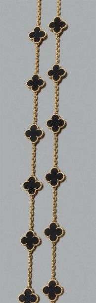 "Alhambra" Sautoir en or jaune 18k orné de motifs "fleur" en onyx. Signé et numéroté. Long.: 75 cm env Poids but: 47.0 gr An onyx and yellow gold necklace by Van Cleef & Arpels.