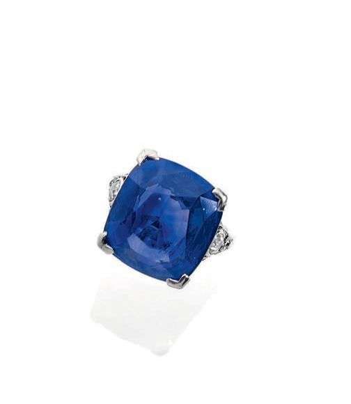 Bague en platine et or gris 18k sertie d'un important saphir de forme coussin épaulé de deux diamants de taille ancienne et de diamants taillés en rose. Poids du saphir: env 16 carats Tour de doigt: 51 Poids brut: 9.6gr Accompagnée d?un certificat du LFG N°314725 précisant: Origine: Birmanie Pas de modification thermique A sapphire, diamond and platinium ring.