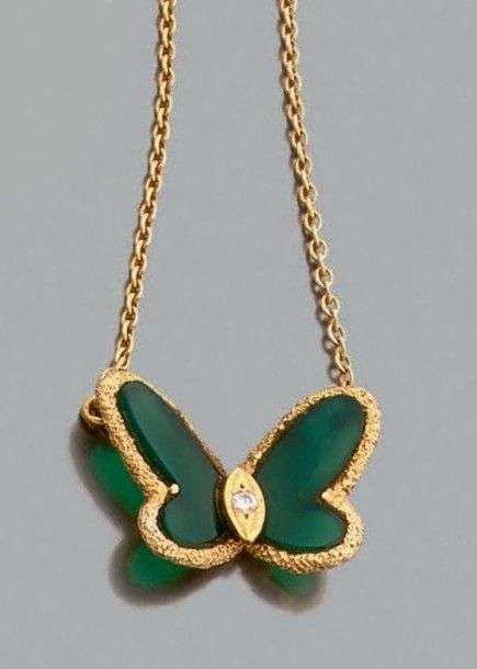 Collier en or jaune 18k orné d'un motif "papillon" en chrysoporase rehaussé d'un brillant. Signé et numéroté. Long.: 23 cm env. Poids brut: 6.8 gr A chrysoprase, diamond and yellow gold necklace by Van Cleef & Arpels.
