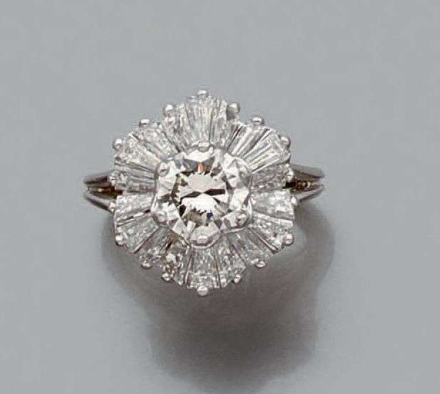 Bague en platine sertie d'un diamant de taille brillant dans un entourage en jupe de diamants calibrés. Poids du diamant central: 1.20 cts env. Tour de doigt: 47 Poids brut: 7.7gr A diamond and platinium ring.