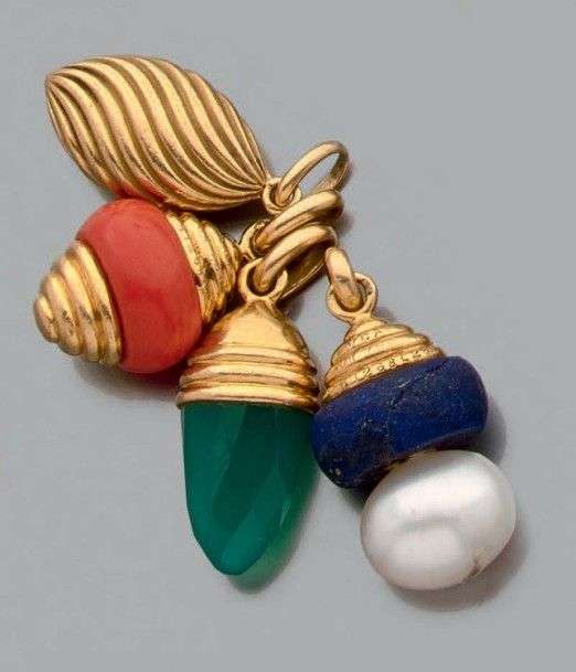Ensemble de 4 breloques en or jaune 18k, corail, lapis lazuli et chrysoprase. Signés et numérotés Poids brut: 21gr Perle de culture sur la breloque lapis lazuli postérieure. A coral, lapis lazuli, chrysoprase, cultured pearl and yellow gold pendants by Van Cleef & Arpels.