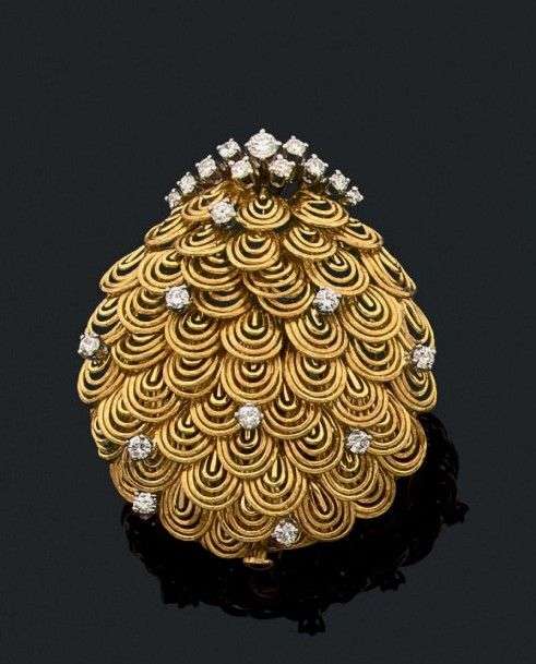 Pendentif broche «écailles» en or jaune 18k rehaussé de brillants. Poids b