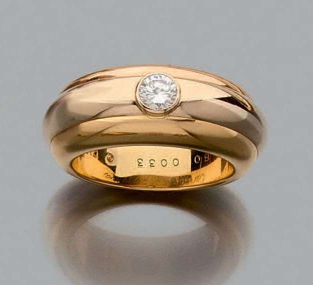 Bague jonc trois ors sertie d'un diamant de taille brillant. Signée et numérotée. Ecrin d'origine. Tour de doigt: 61 Poids brut: 20.2 gr A diamond, pink, yellow and white gold ring by Cartier.