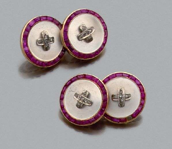 Ensemble composé d'une paire de boutons de manchettes et de boutons de col en or jaune 18k ornés d'un motif de nacre rehaussé de diamants taillés en rose dans un entourage de rubis calibrés. Manque Poids total brut: 11.8 gr A ruby, diamond, mother-of-pearl and yellow gold pair of cufflinks and collar button.