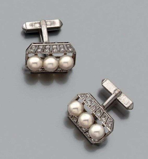 Paire de boutons de manchettes en or gris 14 K sertis de perles de culture épaulées de barettes de brillants. Poids brut: 11.55gr A cultured pearl, diamond and white gold pair of cufflinks.