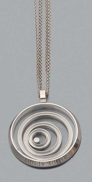 "Happy Spirit" Important pendentif en or gris 18k orné d'un diamant de taille brillant mobile. Signé et numéroté. Avec sa triple chaine Chopard. Long.: 33.5 cm env. Poids brut: 48.8 gr A diamond and white gold pendant by Chopard.