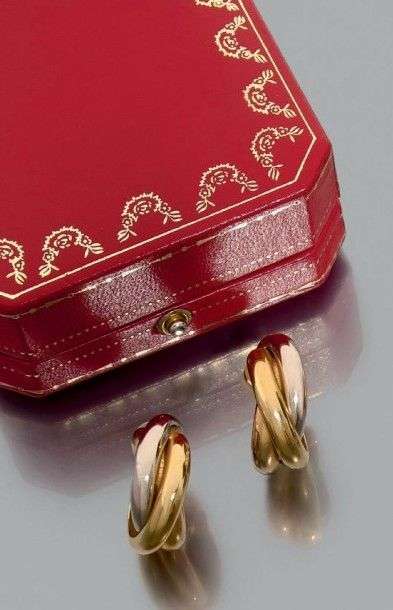 "Trinity" Paire de clips d'oreilles créoles trois ors. Signés et numérotées. Ecrin. Poids brut: 14.6 gr A pink, white and yellow gold pair of earrings by Cartier.