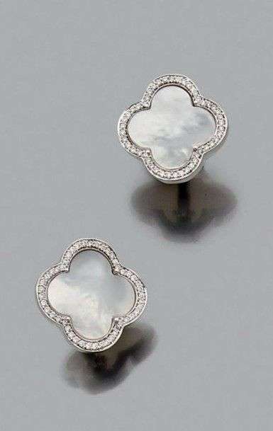 Paire de pendants d'oreilles polylobés ornés d'un motif de nacre dans un entourage de diamants de taille brillant. Poids brut: 7.8 gr A mother-of-pearl, diamonda and white gold pair of earrings.