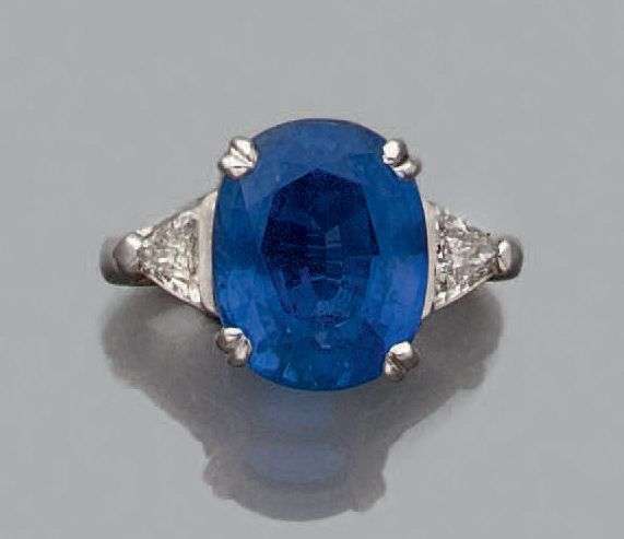 Bague en or gris ornée d'un saphir ovale épaulé de deux diamants triangles. Tour de doigt: 55 Poids brut: 6.28gr A sapphire, diamond and white gold ring.