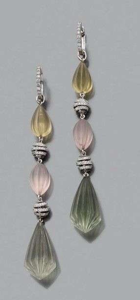 Paire de longs pendants d'oreilles en or gris 18k ornés de pierres gravées alternées de boules articulées serties de brillants. Long.: 8.5 cm env Poids brut: 14.8 gr An hard stone, diamond and white gold pendant of earrings.