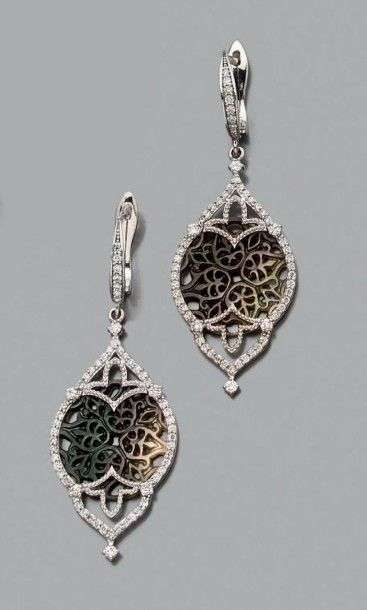 Paire de pendants d'oreilles en or gris 18k sertis d'un motif de nacre gravé dans un entourage de brillants. Poids brut: 7.4gr A mother-of-pearl, diamond and white gold pendant of earrings.