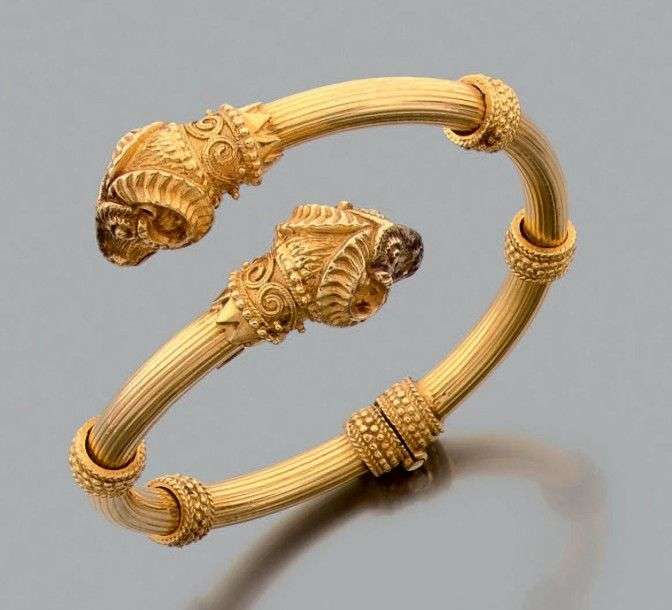Bracelet jonc ciselé en or jaune 18k orné de deux têtes de béliers se faisant face. Signé. Poids brut: 48 gr A yellow gold bracelet by Zolotas.