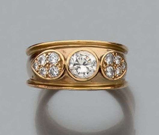 Bague jonc en or jaune 18k sertie au centre d'un diamant de taille brillant épaulé de deux motifs sertis de brillants. Tour de doigt: 54 Poids brut: 9.6 gr A diamond and yellow gold ring.