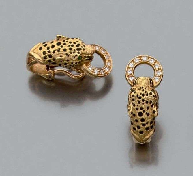 Paire de clips d'oreilles en or jaune 18k ciselés d'une panthère émaillée