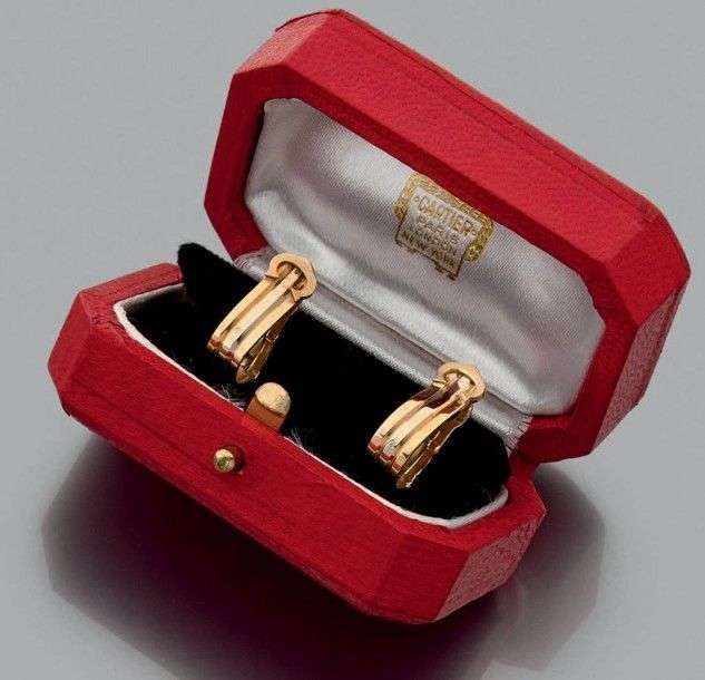 "Trinity" Paire de clips d'oreilles en or 18k. Signée et numérotée N° 240 112. Dans un écrin. Poids: 5.3gr A pink, white and yellow gold pair of earrings by Cartier.