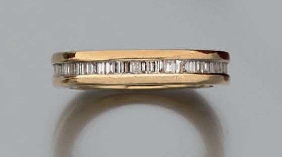 Alliance en or jaune 18k sertie d'une ligne de diamants de taille baguette. Tour de doigt: 54 Poids brut: 6.5 gr A diamond and yellow gold ring.