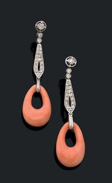 Paire de pendants d'oreilles en or gris 18k sertis d'une chute de diamants retenant un anneau de corail peau d'ange. Long.: 5.3 cm env Poids brut: 8.8 gr A coral, diamond and white gold pendant of earrings.