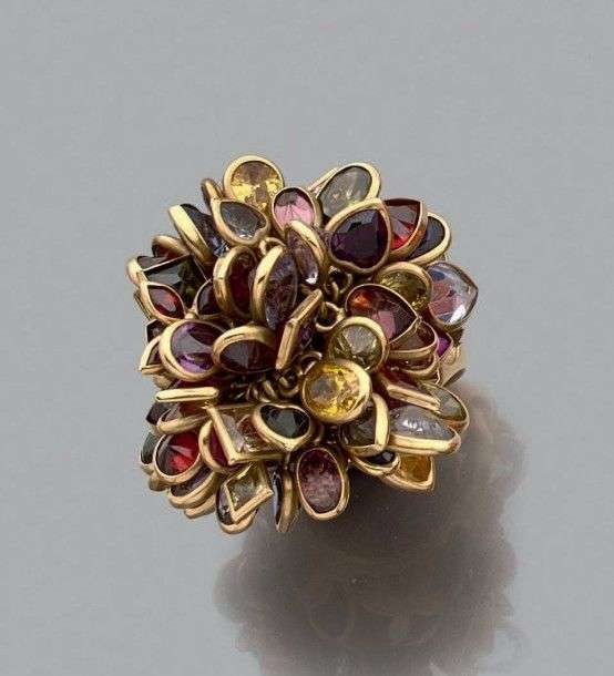 Originale bague en or jaune 18k ornée d'un important ensemble de breloques multicolores. Tour de doigt: 61 Poids brut: 34.3 gr A couloured stone and yellow gold ring.