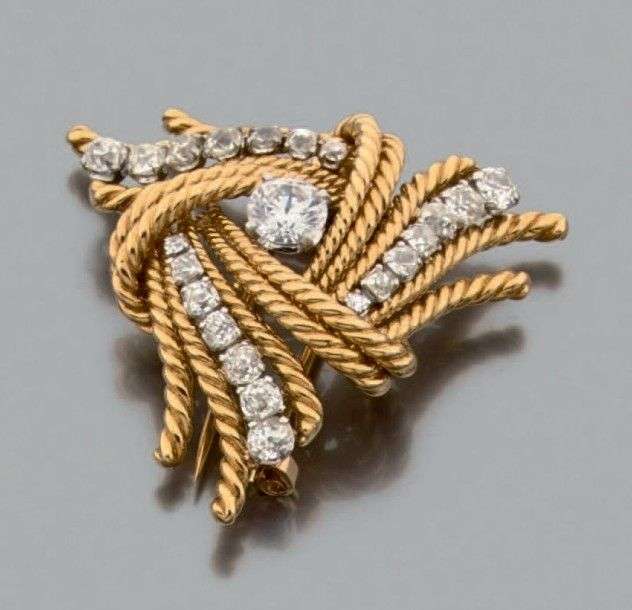 Broche en or jaune et gris 18k torsadé rehaussée de trois lignes de diaman