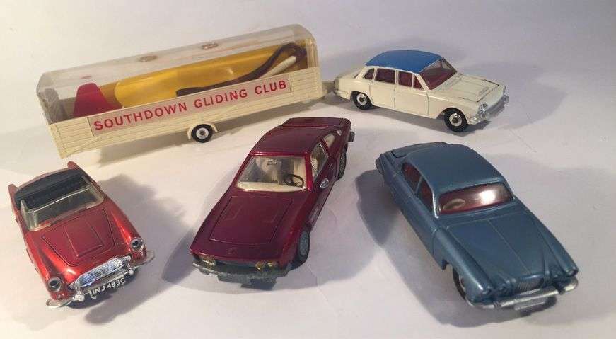 comprenant une JAGUAR MARK X ref 142, une MONTEVERDI ref 190, une ASTON MARTIN DB 5 ref 110, une TRIUMPH 2000 ref 135 avec sa remorque et son planeur ref 118