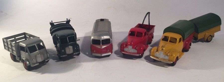 comprenant un autocar ISOBLOC ref 29E3, un STUDEBAKER camion bâché ref 25Q2 et sa remorque ref 25T1B, un STUDEBAKER DINKY SERVICE ref 25RS1, un FORD camion ordures ref 25V, un FORD plateau ridelles ref 25A