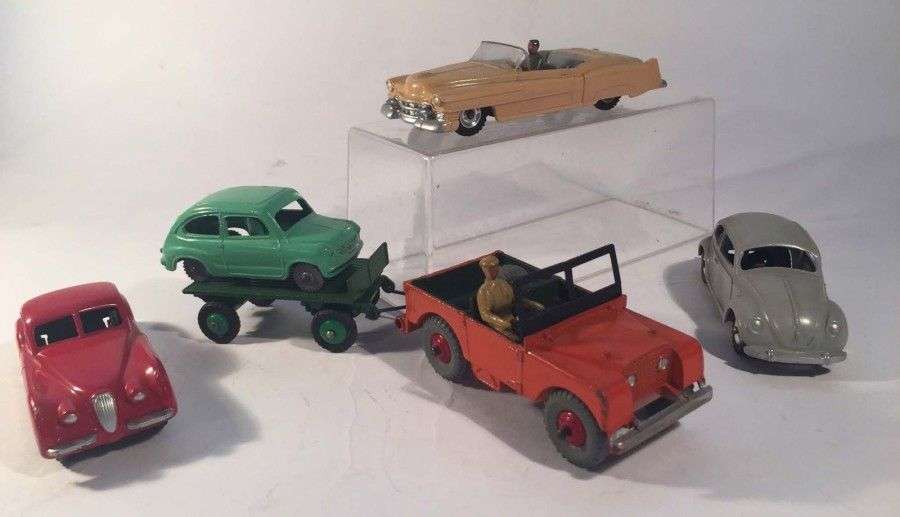 comprenant une VOLKSWAGEN COCCINELLE ref 181, une JAGUAR XK 140 ref 157, une FIAT 600 ref 183, une CADILLAC EL DORADO ref 131, un LAND ROVER ref 118, une remorque 4 roues ref 25 G
