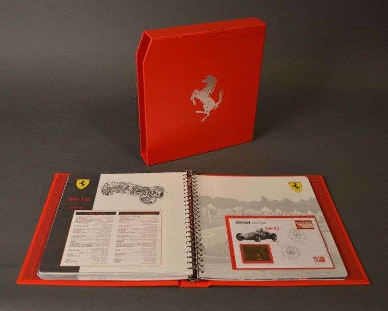 reprenant une collection de timbres à l'effigie de la marque Ferrari. Certificat d'authenticité. Parfait état.