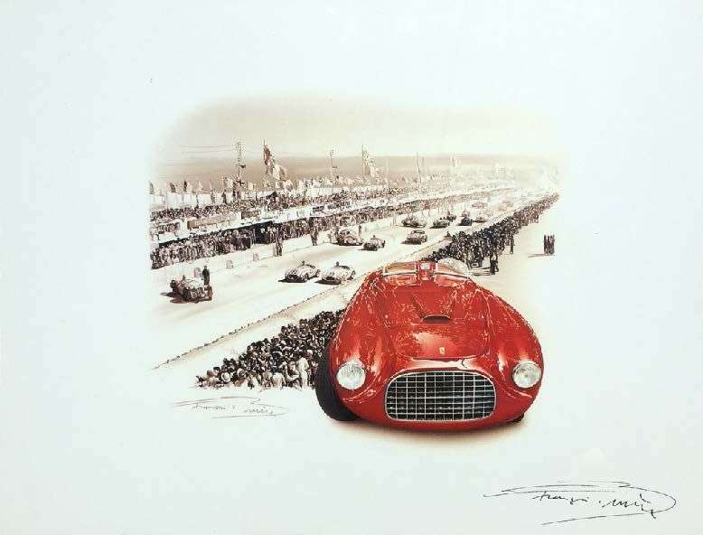 par François Bruère représentant une Ferrari au Mans, signée en bas à droite.