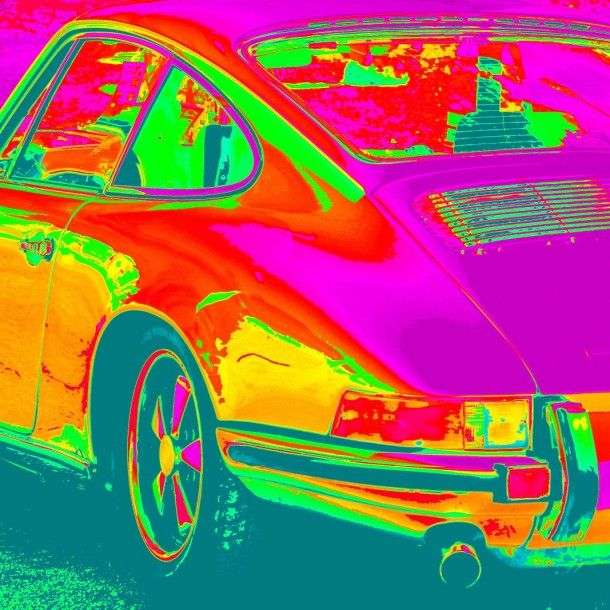 Peinture Porsche 911 pop art exemplaire unique 100 x 100 cm Certificat d'authenticité Année d'édition: 2014 Photographie à l'encre automobile sur aluminium prise de vue réalisée le 4 juillet 2014 lors des courses du Mans Classic un châssis bois au dos de 18 mm permet la mise en place à bord arasant d'un cadre dit «caisse américaine» en aluminium, avec attache métallique