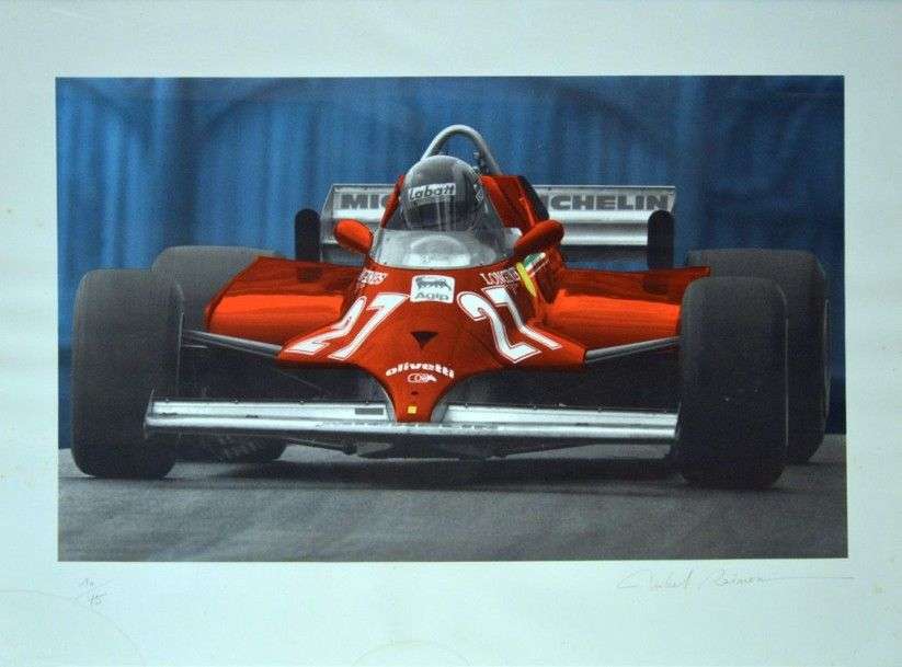 Lithographie Ferrari Formule 1 type 126CK N°27 de Gilles Villeneuve par MICHEL RAIMON, signée en bas à droite. Edition limitée N°10/75e