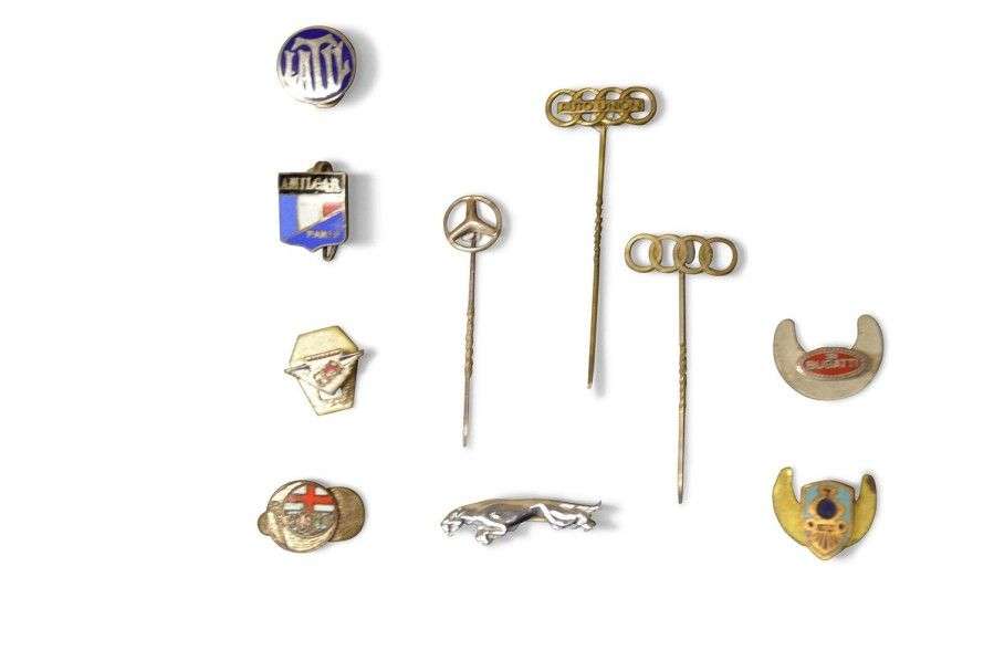 Lot de 10 épinglettes Comprenant les marques suivantes: AUTO UNION, LATIL, BERLIET, JAGUAR, MERCEDES, ALFA ROMEO, AMILCAR, BUGATTI....