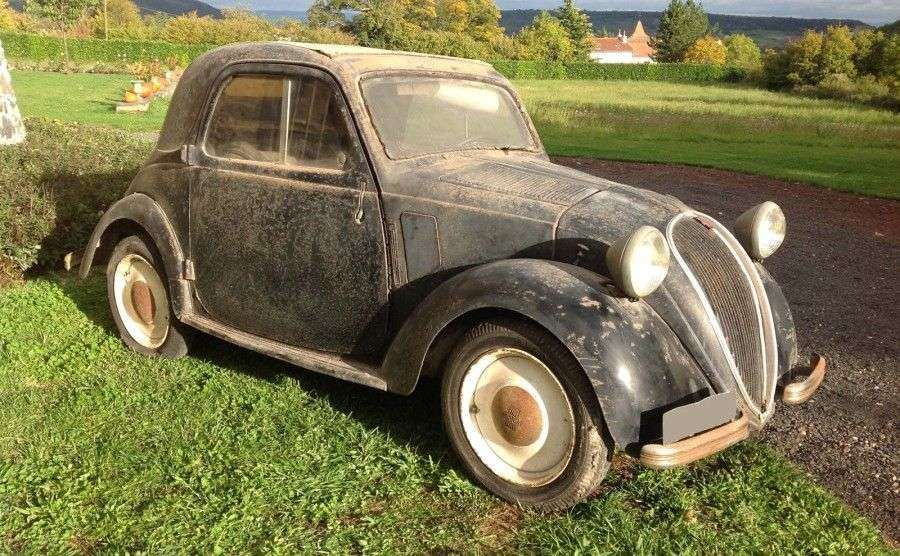La voiture que nous présentons est un modèle d'avant guerre, de type découvrable, elle arbore une robe noire et un intérieur en tissu beige. Le toit découvrable est beige lui aussi assorti aux jantes. C'est une véritable sortie de grange, une voiture dans son jus et proche de sa configuration d'origine. Mise en circulation en 1936 elle a ensuite été immatriculée dans le département de l'Eure en 1954. Elle arbore depuis toujours les mêmes plaques d'immatriculation preuve de la stabilité de son historique. Elle est dans les mêmes mains depuis 1968. Elle n'a à cette époque que très peu roulé et a depuis de longues années été remisée sans tourner. Complète, cette