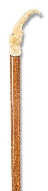 Canne à haute poignée (13cm) en ivoire sculptée en ronde bosse d'une tête d'éléphant aux yeux de verre et trompe déployée, fût en Malacca, férule laiton à talon acier.