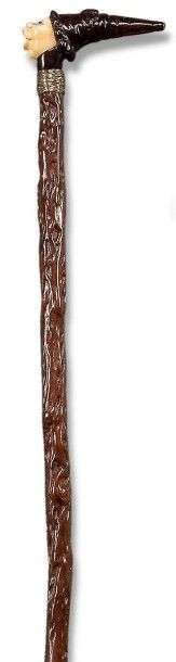 Canne de fumeur «cigare» à poignée en bois verni, sculptée en ronde bosse d'une tête coiffée d'un long chapeau noir, face en ivoire aux yeux de sulfure, bouche largement ouvertes permettant de recevoir le cigare, le bout percé du chapeau, formant le bec du fume-cigare. Bague aux fils d'argent tressés, fût en bois noueux naturel, férule en laiton à talon d'acier.